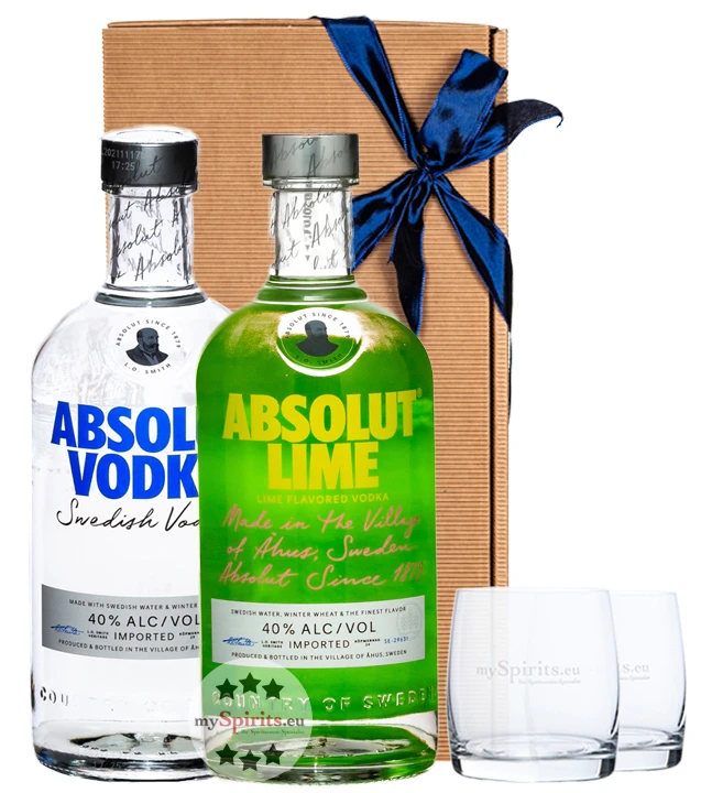 Das Vodka Geschenkset von Absolut beinhaltet eine 0,7 Liter-Flasche Absolut Vodka, eine 0,7 Liter-Flasche Absolut Vodka Lime und zwei original mySpirits Tumbler-Gläser. Das Set ist somit ein echter Hingucker für Absolut-Fans oder zum Verschenken für Vodka-Liebhaber.