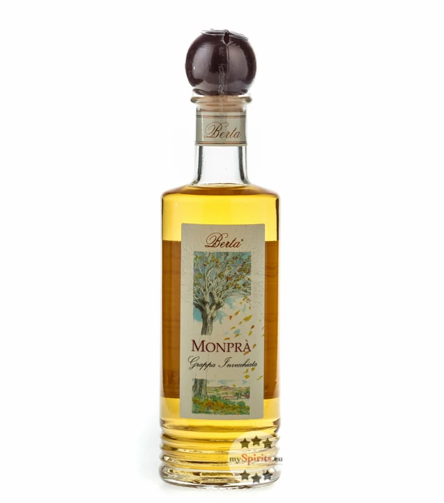 Der aus den beiden im Piemont heimischen Rotweinsorten Barbera und Nebbiolo hergestellte Tresterbrand Berta Monprà wird ein knappes Jahr lang in Fässern aus slawonischer Eiche ausgebaut. Dabei entwickelt er seine golden leuchtende Bernsteinfarbe und seinen weichen, harmonischen Charakter.
