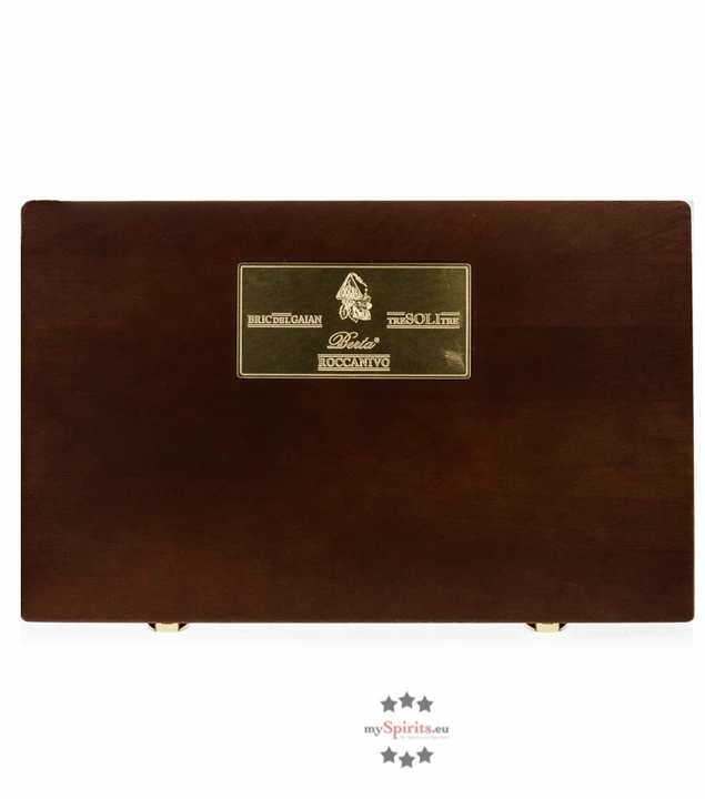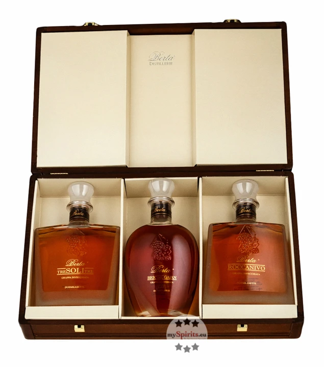 Die große Holzkiste mit Messing-Plakette enthält jeweils eine 0,7 Liter Dekanter-Flaschen von jeder der drei Sorten. Genießen Sie Berta Roccanivo, Bric del Gaian und Tre Soli Tre aus dieser schönen Aufmachung. Die Holzkiste können Sie mit den Einzelflaschen immer wieder nachfüllen. Auch als wertvolles Geschenk für Grappa-Liebhaber und Kenner ist das 3er Set von Berta Ihre erste Wahl.