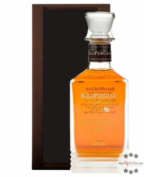 Der Name ist wieder einmal etwas sperrig geraten. Damit zeigt Berta einmal mehr, dass es bei einem solchen Spitzengrappa wie SoloPerGian um ein herausragendes, nicht sofort fassbares Destillat geht, dem griffige Markennamen nicht gerecht werden können. Die wenigen Fässer sind alle nummeriert, und abgefüllt wird keineswegs regelmäßig. Damit richtet sich Berta Solo Per Gian an Kenner und Genießer besonderer Tresterbrände, die die Qualität von Berta zu schätzen wissen. Erleben Sie die außergewöhnliche Harmonie dieses Grappa Affinata und schmücken Sie Ihre Hausbar mit der edlen Dekanter-Flasche, die sie in einer eigenen kleinen Holzvitrine erreicht.