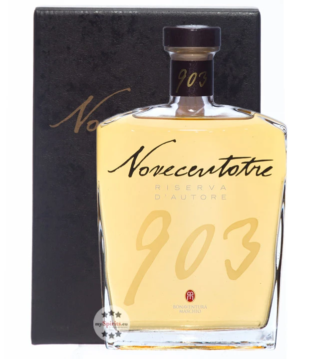 Die traditionsreiche Brennerei Bonaventura Maschio in Venetien hat mit einer Verkürzung des Geburtsjahres ihres Namensgebers (1903) um die Tausenderstelle eine Marke geschaffen, die im Grappa-Bereich Aufsehen erregt und für ein hohes Qualitätsversprechen steht. Am bekanntesten ist der fassgelagerte Grappa 903 Barrique, doch die Zahl „Novecento Tre“ (903) tragen auch andere Grappa-Spezialitäten aus dem Hause Bonaventura Maschio. Der „Riserva d’Autore“ ist dabei eine besondere Mischung der verschiedenen Trester, die der Brennmeister persönlich nach seinen Vorstellungen erschaffen hat: Autore steht im Italienischen nicht nur für den Autor, sondern bezeichnet jede Art von kreativem Schöpfer.