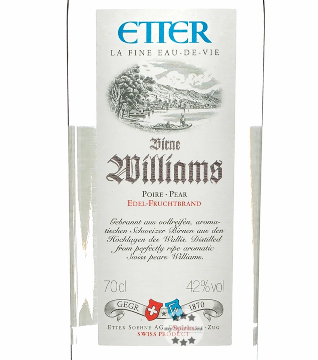 Produkte aus der Schweiz sind bekannt für ihre hohe Qualität – so auch die Fruchtbrände der Destillerie Etter aus Zug. Das schweizer Familienunternehmen, das sich auf naturreine Obstbrände spezialisiert hat, brennt schon seit 1870 Brände aus heimischen Früchten. Etter Birne Williams gehört natürlich auch in der Schweiz zum Produktrenner unter den Bränden – und das zu Recht. Etter Birne Williams wird ausschließlich aus vollreifen Williamsbirnen der schweizer Region “Rive droite“ am Rhône-Ufer des Wallis gebrannt. Nach acht bis zehn Wochen Gärung der Früchte, wird aus dem „Herzstück“ der Destillation Etter Birne Williams hergestellt. In Edelstahltänken gelagert, kommt schließlich der vollreife Geschmack der Williamsbirnen auch im Etter Birne Williams zur Geltung.