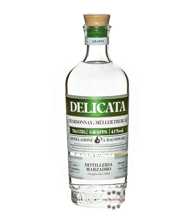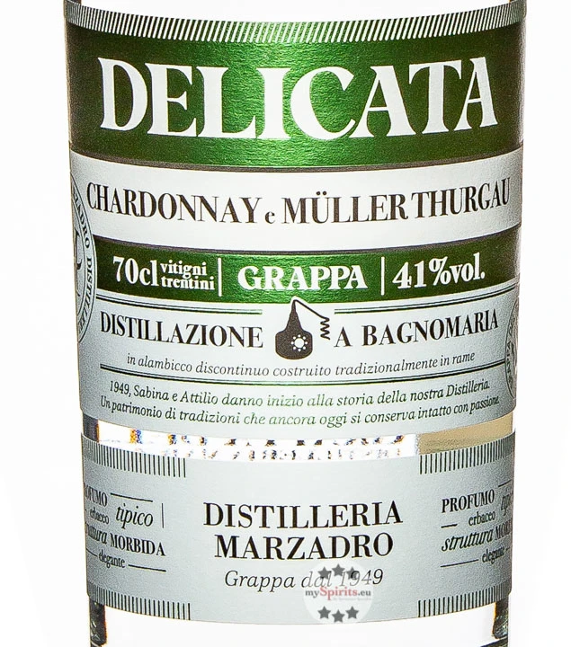 Typisch für die Bivitigni-Reihe von Marzadro ist die Verbindung zweier regionaler Rebsorten. So begeistert jeder Grappa mit einem ganz eigenen sortentypischen Charakter. Der Beiname „Delicata“ könnte nicht treffender gewählt sein, verwöhnt der Grappa die Sinne doch mit einer zarten Eleganz und grasig-frischen Nuancen in Duft und Geschmack.