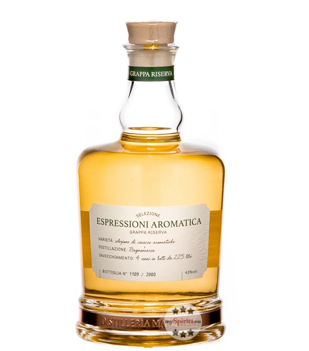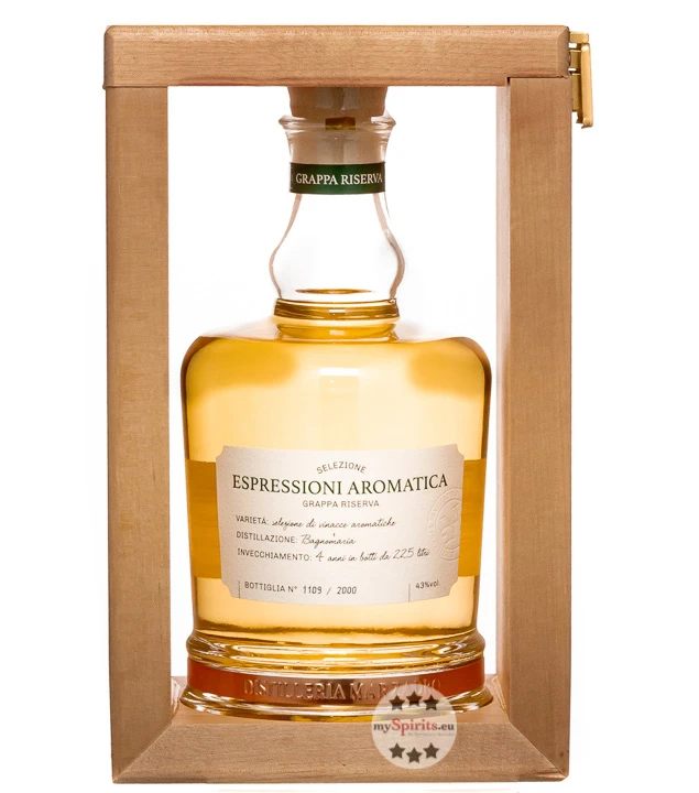 Die Distilleria Marzadro bereichert das Ergebnis einer sorgfältigen Destillation durch die Reifung des Grappas in Holzfässern. Dabei vereinen die Grappa Espressioni Reihe von Andrea Marzadro das Beste, was die Brennerei in diesem Jahr zu bieten hatte. Die Grappa Espressioni haben das Ziel, den Genießer in stets neue Geschmackserlebnisse von gehobener Qualität zu entführen. Der Marzadro Grappa Espressioni Aromatica wird durch die Bagnomaria-Destillation des Tresters aus den Rebsorten Gewürztraminer und Müller Thurgau gewonnen. Diese werden vor der Reife gekonnt miteinander vereint.