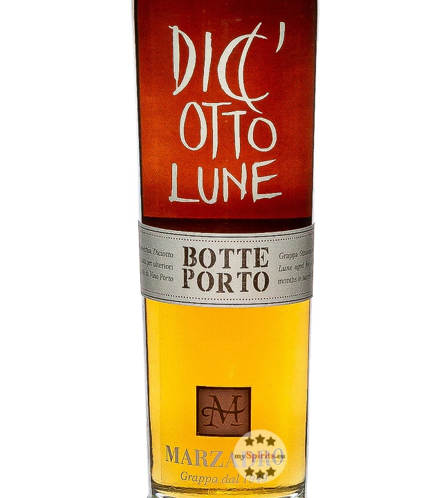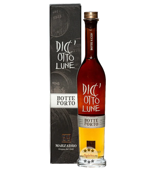 Für Marzadro Le Diciotto Lune Riserva Botte Porto wird der bekannte 18 Lune zusätzliche 18 Monate in hochwertigen Portweinfässern gelagert, wodurch er einen einzigartig fruchtigen Duft und Geschmack erhält. Die führende Holznote des Grappas wird durch die zusätzliche Lagerung in den Portfässern erneut bestätigt und geprägt. In der kleineren 0,2 Liter Flasche – die größere Flasche gibt es mit einer Füllmenge von 700 ml – können Sie Grappa Riserva Botte Porto verkosten und probieren. Auch als Geschenk eignet sich der aus den Rebsorten Marzemino, Teroldego, Merlot, Muskatteller und Chardonnay hergestellte Grappa sehr gut.