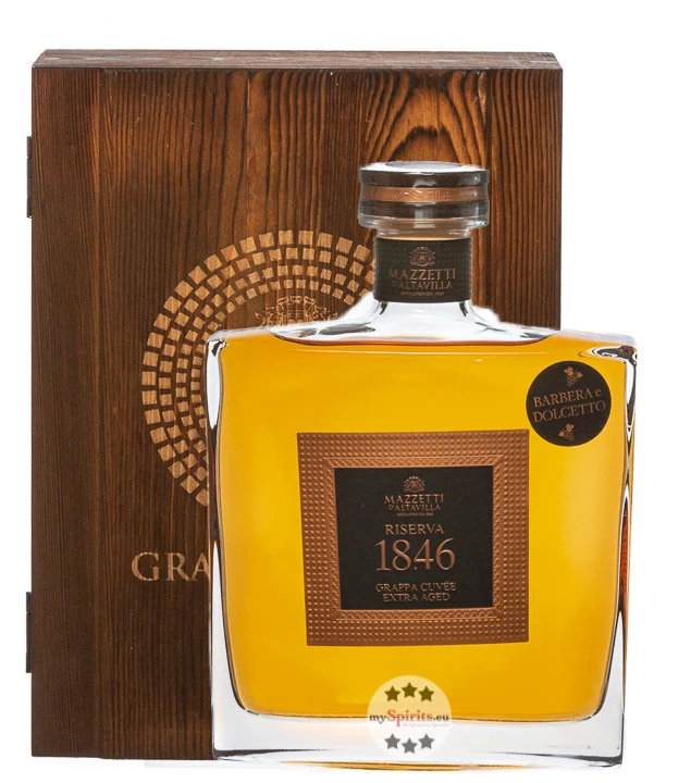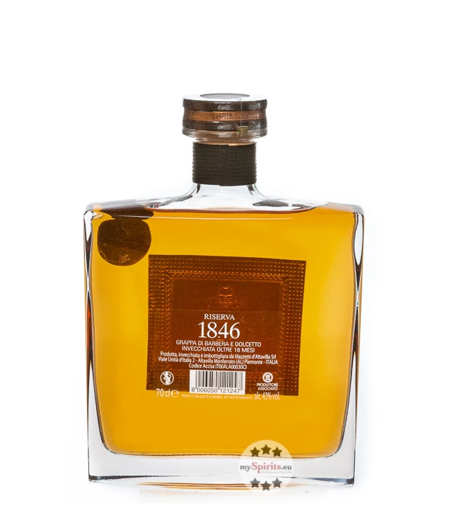Die rote Rebsorte Barbera, welche in Monferatto im Piemont beheimatet ist, zählt zu den hochwertigsten und wichtigsten Rebsorten Italiens. Neben Barbera gehört auch die Dolcetto Rebsorte dazu. Der trockene Charakter der Dolcetto-Rebe und der intensiv fruchtige Duft in der Nase und im Geschmack der Barbera-Rebe ergeben einen ausgewogenen und starken Grappa von Mazzetti. Die Zahl 18 weist auf die 18-monatige Lagerung in Holzfässern hin. Die Zahl 46 steht für die verschiedenen Fässer, die für diesen Grappa Riserva verwendet wurden. Die Zahl 18.46 weist auch direkt auf das Gründungsjahr der Traditionsbrennerei Mazzetti d’Altavilla hin. Die Destillation erfolgt durch das diskontinuierliche Verfahren: Dabei wird nach jedem Brennvorgang die Brennblase entleert und gereinigt und anschließend wieder neu befüllt. Die Destillate reifen dann über zwölf Monate in Eichenholzfässern und anschließend sechs Monate in Kastanienfässern.