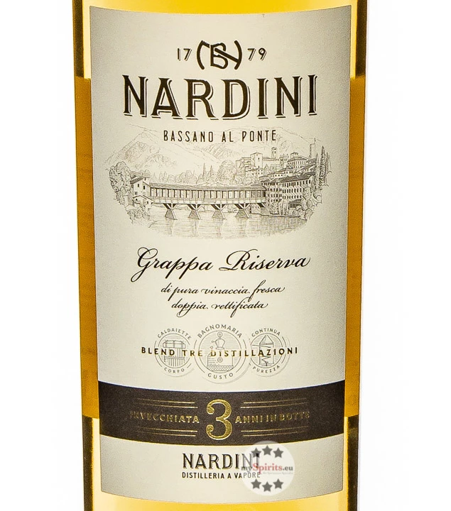 Schon lange bevor Bassano Veneto in Bassano del Grappa umbenannt wurde, gab es in diesem schönen Städtchen in Venetien die Brennerei Nardini. Als älteste Grappa-Destillerie des Landes brennt Nardini seit 1779 feine Tresterbrände aus Traubenpressrückständen – den sogenannten Trestern – der umliegenden Weinregionen. Nardini Grappa Riserva 50° wird aus Trestern aus dem Friaul und Venetien produziert. Die Destillerie Nardini wählt für ihre Grappas vorwiegend Trester der für diese Regionen typischen roten Trauben wie Cabernet, Sauvignon und Merlot und hellen Trauben wie Pinot Bianco und Friulano. Nachdem diese Traubentrester für Nardini Grappa Riserva 50° zu einer einzigartigen Mischung zusammengestellt und destilliert wurden, reift der Grappa für mindestens drei Jahre in Holzfässern aus slawonischer Eiche. Diese Reifung gibt Grappa Riserva von Nardini sein besonders sanftes und duftendes Profil in Duft und Geschmack.