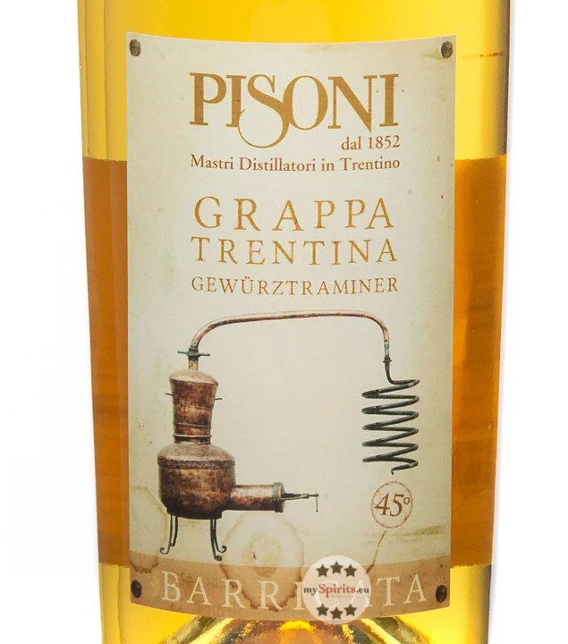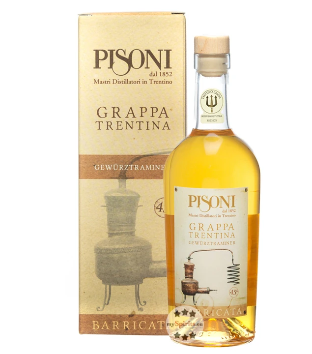 Die „Verwendung von Rohstoffen von tadelloser Qualität und Frische“ ist oberste Regel im italienischen Hause Pisoni – und wird auch bei Pisoni Trentiner Gewürztraminer Barricata Grappa befolgt. Die elegante Weißweinsorte Gewürztraminer gibt ihre Aromen für diesen Grappa her, welche dank der Fasslagerung in französischen Eichenfässern noch ausgereift werden. In den Fässern lagerten darüber hinaus zuvor die Weine Sarica Bianco und der Vino Santo Trentino Classico, wodurch eine außergewöhnliche Aromen-Kombination entsteht.