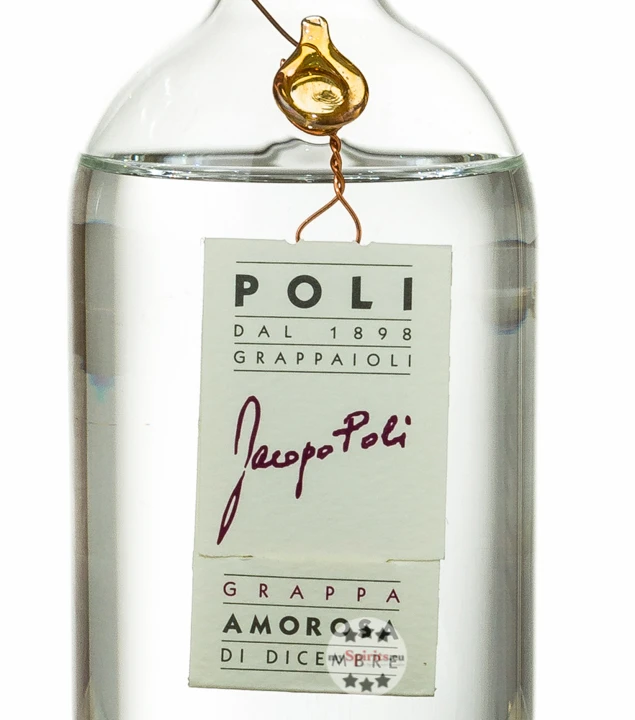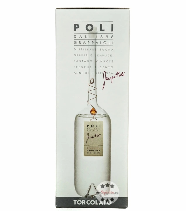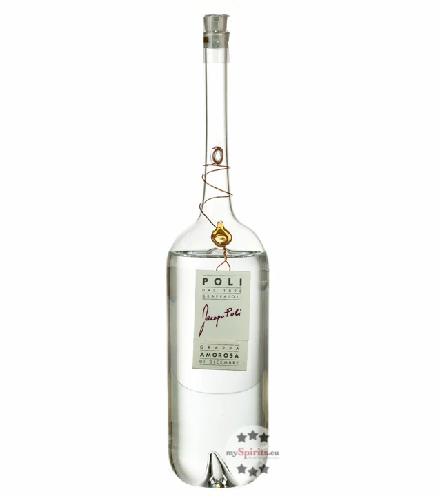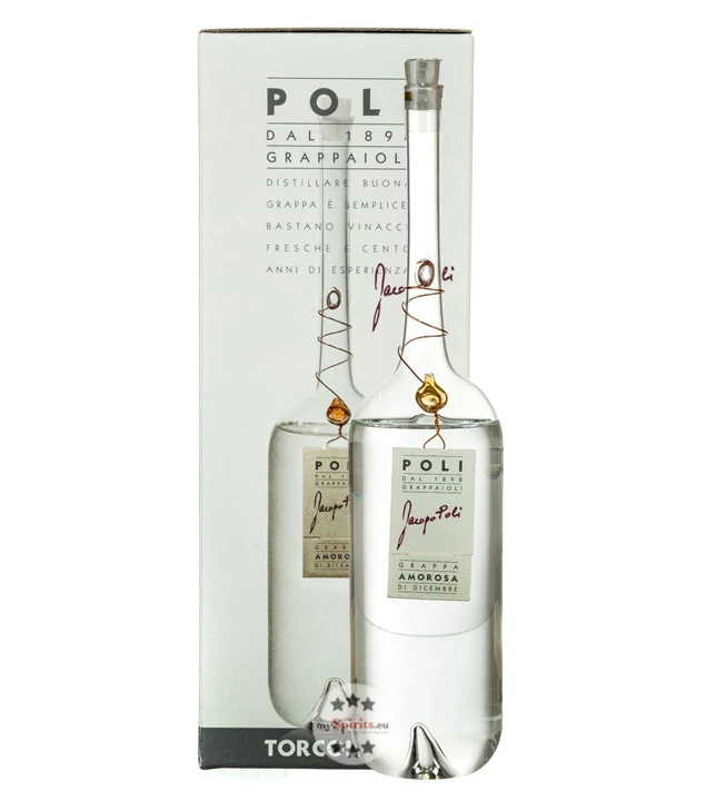 Für Poli Grappa Amorosa di Dicembre hat die Brennerei Poli lange an der besten Art und Weise gearbeitet, perfekte Trester von getrockneten Vespaiolo-Trauben für Torcolato-Wein zu erhalten, die den Geschmack der zugrundeliegenden Rebe beibehalten und geschmacklich dennoch nur die Essenz der getrockneten Trauben tragen. Nach jahrelangem Experimentieren konnte schließlich ein großartiges Endprodukt – Poli Grappa Amorosa di Dicembre – lanciert werden. Ein junger Jahrgangsgrappa aus verspäteter Destillation im Dezember. Um die Besonderheit des Poli Grappa Amorosa di Dicembre zu zeigen, wird dieser in handgefertigte, kunstvolle Glasflasche abgefüllt.