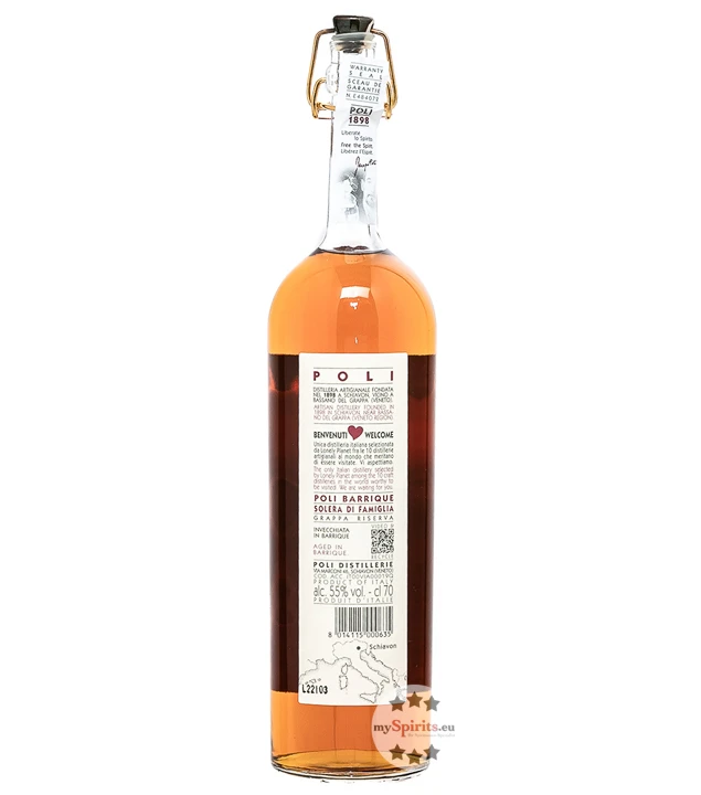 Im Laufe der Jahre entwickelte die Familie Poli aus diesen Fässern ein besonderes Fasssystem, bei dem der jährlich nachgefüllte junge Grappa mittlerweile insgesamt 98 Fässer im Solera-Verfahren durchläuft. Der jährlich daraus kreierte Grappa Barrique Solera di Famiglia 1989 überzeugt mit Duftnoten von Vanille, geröstetem Holz, Vanille, Kakao und Kaffee. Sein kraftvoller und harmonischer Charakter verkörpert den Stolz auf das Vermächtnis, das im Familienbetrieb weitergeführt wird, wie es Toni Poli einst wünschte.