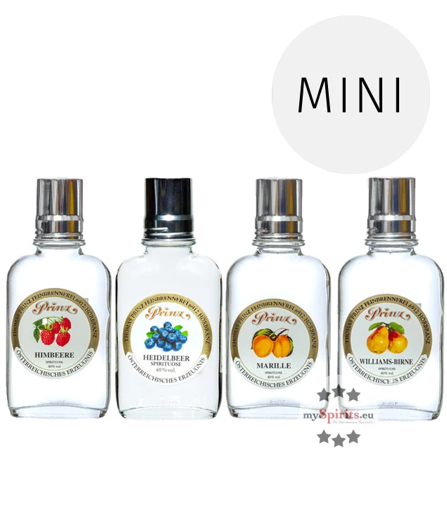 Viermal Obstschnaps, viermal Genuss, viermal eine kleine 0,1 Liter-Flasche – so sieht das fruchtige Flachmann 4er Set der Fein-Brennerei Prinz aus. Die Destillerie aus der Bodenseeregion Österreichs präsentiert mit den 40 %-igen Schnäpsen eine Reihe klarer Schnäpse, die mit 40 % Alkoholgehalt vollmundig und dennoch mild schmecken. Neben Sorten aus Kräutern (z.B. Enzian) oder Nüssen (Haselnussschnaps), sind vor allem klassische Obstschnäpse in der Reihe vertreten. Im unserem Flachmann 4er Set fruchtiger 40 %-iger Spirituosen, finden Sie vier verschiedene Sorten, die jeden Geschmack treffen:
