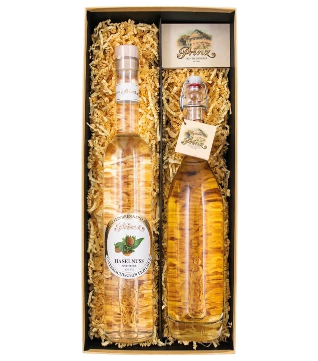 Schenken Sie das ausgewählte Geschenk-Set mit zwei beliebten Haselnuss-Produkten der Feinbrennerei Prinz. Im hochwertigen Geschenk-Set Nuss Genuss ist je eine 0,5 Liter-Flasche des Prinz Haselnuss Schnaps und der Prinz Alten Haselnuss enthalten. Die Halbliterflaschen sind in einer schönen Deko-Schachtel verpackt.
