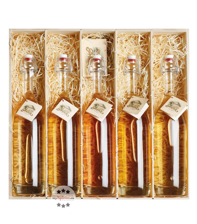 Schenken Sie das ausgesuchte Geschenk-Set mit den beliebten Obstschnaps-Klassikern der Alten Sorten der Feinbrennerei Prinz. Die Alten Sorten gehören zu den beliebtesten Schnäpsen von Prinz. Sie werden nach der Destillation in Holzfässern zur weiteren Reifung gelagert, was ihnen einen besonders milden, fruchtig-weichen Geschmack verleiht. Im hochwertigen Geschenk-Set Schätze aus dem Holzfass ist je eine Sorte Alte Marille, Alter Williams, Alte Wald-Himbeere, Alte Haus-Zwetschke und Alte Kirsche in der 0,5 Liter-Flasche enthalten. Die Halbliterflaschen der Alten Sorten sind in einer edlen Holz-Schatulle verpackt.