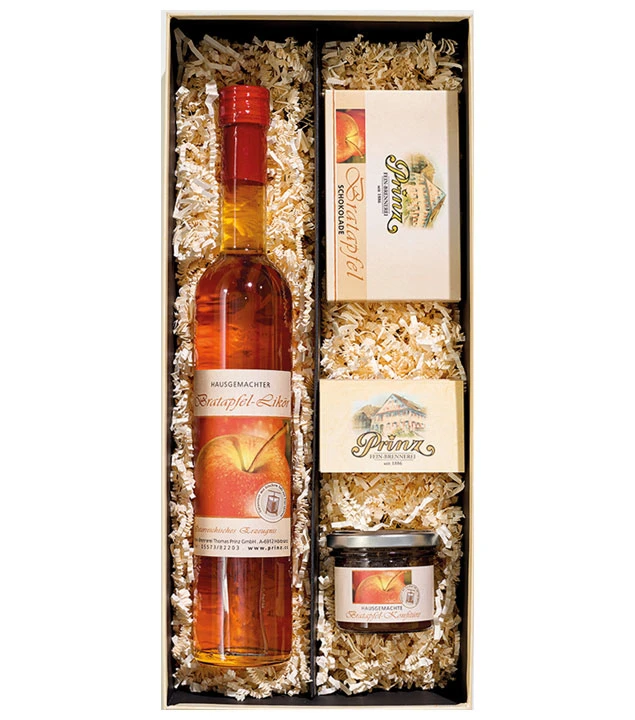 Schenken Sie den erstklassigen Prinz Bratapfel Likör der Feinbrennerei Prinz in der Halbliterflasche kombiniert mit einer köstlichen Bratapfel-Konfitüre und einer leckeren Bratapfel-Schokolade. Erstklassige Qualität aus Hörbranz in Vorarlberg in Österreich, in schöner Deko-Schachtel verpackt.