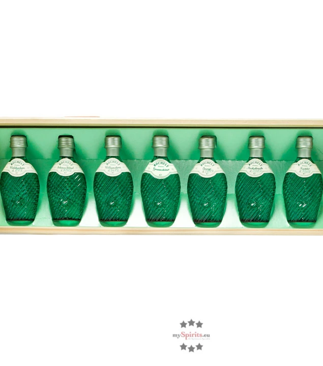 Edelbrände von Rochelt sind hohe Qualität zum zugegebenermaßen auch nicht geringen Preis. Wer sich gerne erst einmal durch die verschiedenen Obstbrände probieren möchte, bevor er sich eine große Flasche der luxuriösen Schnäpse zulegt, ist mit diesem Set bestehend aus 7 Rochelt Schnaps Miniaturen zu je 0,04l genau richtig. Die sieben kleinen Flaschen sind den großen Flaschen detailgetreu nachempfunden in ihrer smaragdgrünen Flasche und befinden sich im typischen Rochelt-Holzkistchen.
