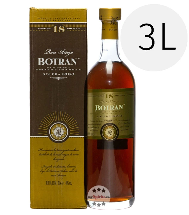 Der bereits mehrfach bei hochrangigen internationalen Spirituosen-Wettbewerben mit Goldmedaillen ausgezeichnete Rum Botran 18 ist hier in der außergewöhnlichen und voluminösen 3 Liter-Flasche erhältlich. Eine herkömmliche Magnum-Flasche ist bereits groß und beinhaltet 1,5 Liter – diese Ron Botran Flasche ist doppelt so groß und hält damit doppelt so lange. Ein ideales Geschenk für alle, die Rum in großen Flaschen mögen.