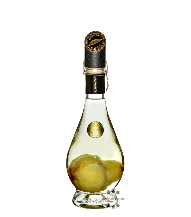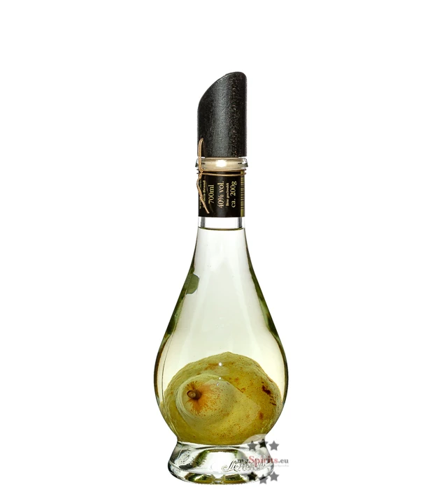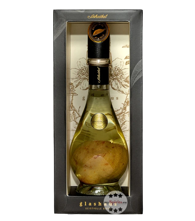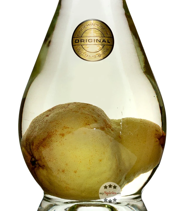 Bestellen Sie sich gleich eine der wenigen Karaffen von Scheibel, in denen dann tatsächlich eine wunderschön runde und ausgereifte Williamsbirne den enthaltenen Birnenbrand veredelt – die Flasche darf auch mehrmals nachgefüllt werden!