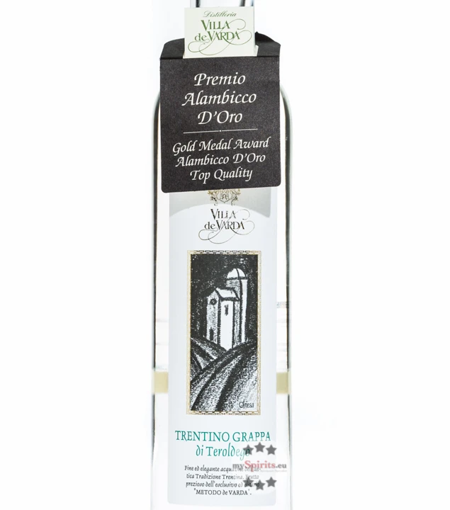 Im wunderschönen Trentino nördlich des Gardasees in Italien gelegen, gedeihen nicht nur sonnenverwöhnte Weintrauben unter besten Bedingungen, es werden auch großartige Grappas produziert. Denn wo Trauben wachsen und zu Wein und Most verarbeitet werden, bleiben auch Pressrückstände – die sogenannten Trester – zurück, aus denen Grappa destilliert wird. Villa de Varda Grappa Teroldego Mezzolitro wird dabei aus sortenreinen Trestern der Rebsorte Teroldego hergestellt. Die schöne Halbliterflasche des Tresterbrandes eignet sich auch als tolles Geschenk oder als Probierflasche zum Kennenlernen.